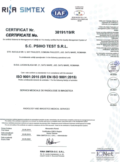 Sistemul de management este certificat în conformitate cu standardul ISO 9001:2015 emis de Organizația Internationala pentru Standardizare, standard acceptat în întreaga lume pentru sistemele de management a calitătii.
